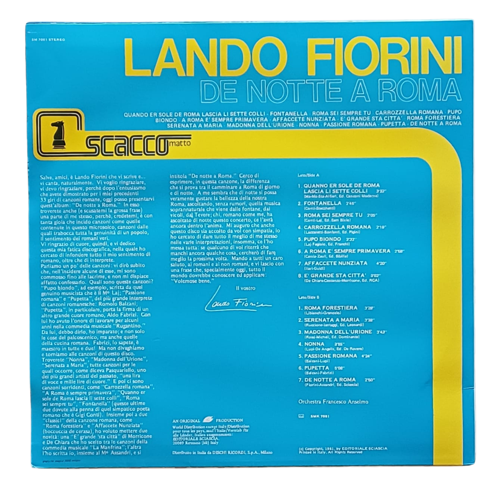 Lando Fiorini – De Notte A Roma (Vinile 33 Giri, Scacco Matto – SM 7001) | Canzone Romana, Tradizione Italiana